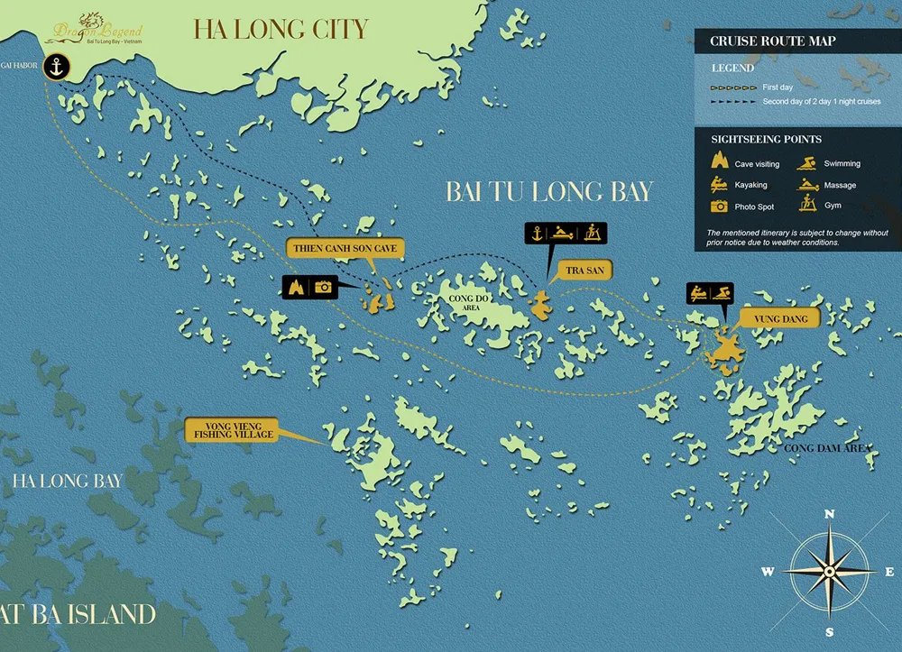 The 2 Dragon Legend ships are the newest members of the Indochina Junk fleet, proudly marking the highest standards of construction. Each Dragon Legend boat features 24 luxury cabins, 4 decks with both inside and outside restaurants, a spa, bar, sundeck area and other entertainment options. Two days, one night untouched cruise of Bai Tu Long Bay is ideal for you to discover the natural beauty and local life. This trip takes you deep into the wonder of nature and the experience of a memorable night in the majestic bay.