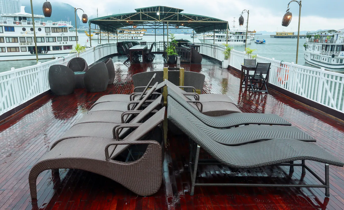 17:30: Join the Sunset Party on the Sundeck while the boat cruises to the Cong Do area to anchor for the night (Happy Hour offer from 5:30 pm - 7:30 pm).