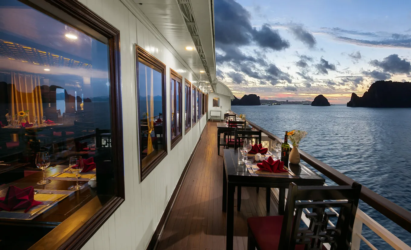 La Regina Classic, the newest ship of the La Regina Cruise Team, stands out with its oriental design. The ship blends modern and ancient styles, creating a unique and inviting atmosphere. The luxurious and sophisticated space feels akin to a royal palace on the tranquil blue sea.