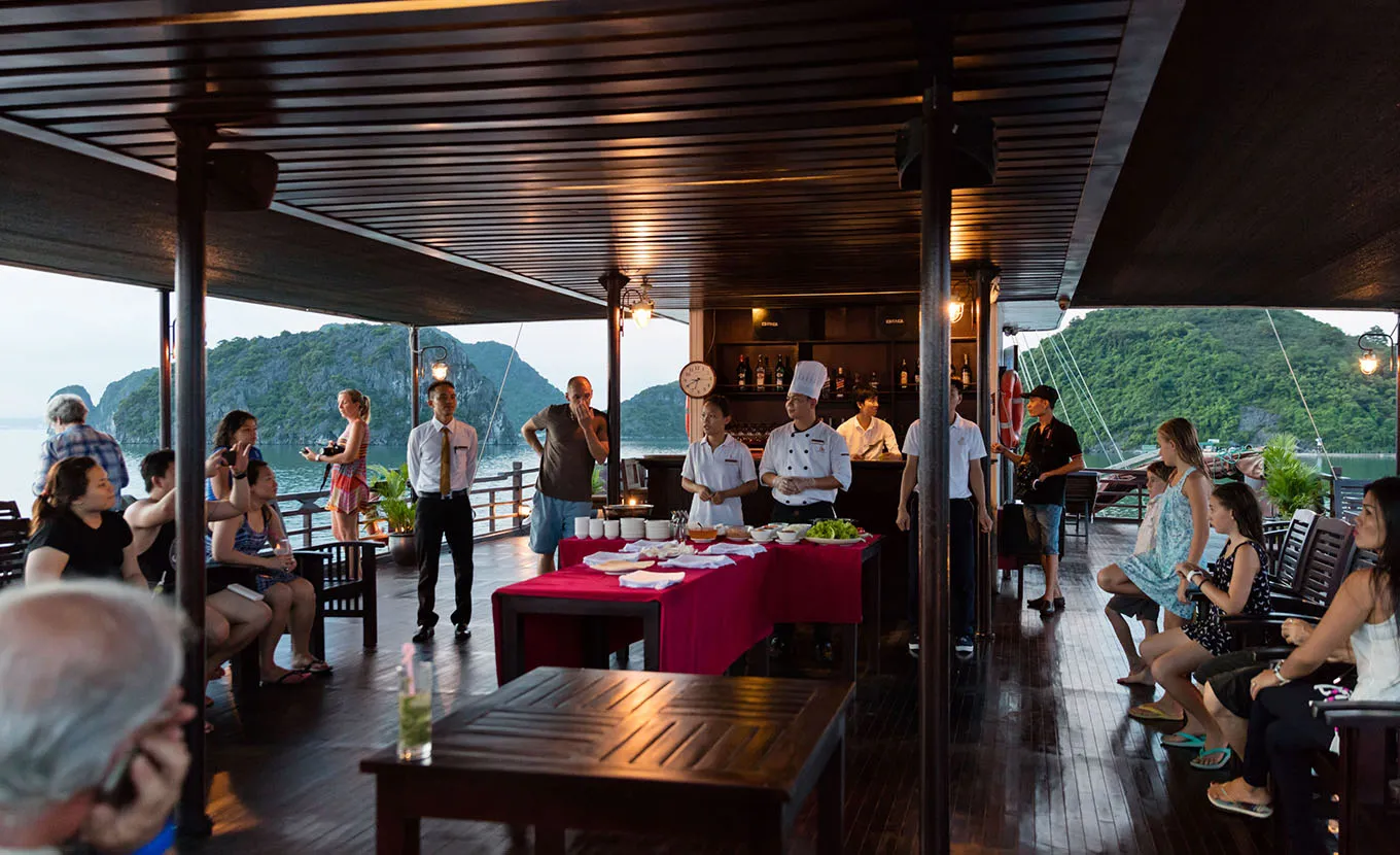18:30: Attend the Cooking class on sundeck – How to make Vietnamese spring rolls - traditional Vietnamese food. Then enjoy Happy Hour (Buy one drink-get one free). It is time for chit chat and relaxing. Watch the magnificent sunset over Halong Bay.