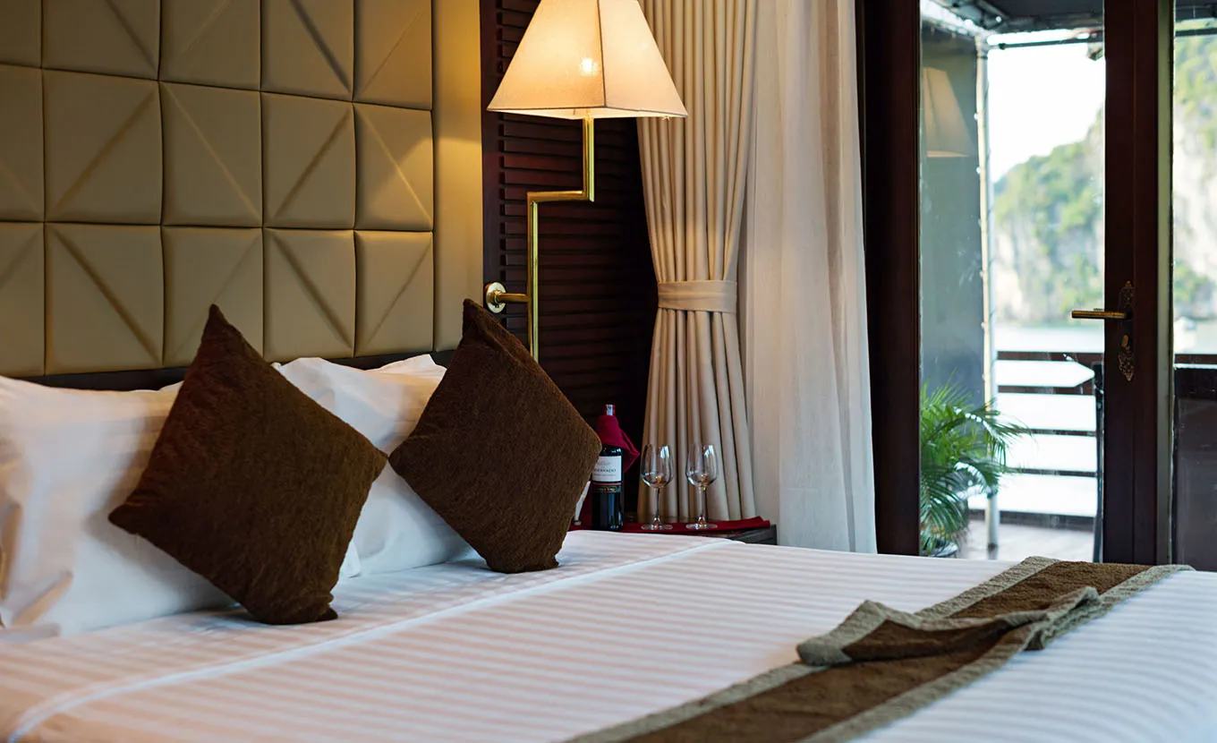 Enjoy buffet lunch with Vietnamese dishes served while cruising through the bay, passing the most beautiful and quiet areas, such as Incense Burner, Dog Stone Islet, Fighting Cock, Soi Sim beach, Coconut Three Islands In the afternoon, visit Tung Sau area, covered by the leaping rocks, cultured pearl fishery. You can wit yourself the process of the jewel, from culturing to harvesting and sculpting. Moreover, you have a chance to do kayaking based on your preference. Enjoy busy space with pearl maker, you can experience the completion of pearl. Visiting the beautiful Titov beach for swimming (if the weather permits), Titov Beach is especially famous for its fresh atmosphere, clean water, and smooth white sand that create a great ambiance for tourists to relax or passengers can take steps to reach on the top of  Titov island to have a whole panorama view of Halong Bay. Back to the boat and free time while sailing to Luon Bo area, and anchor for overnight.