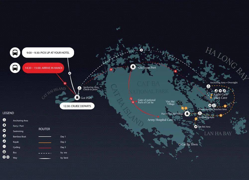 8:00: Then you take a bus route for about 20 minutes on Cat Ba Island from Gia Luan Pier to visit Army Hospital Cave, a special place to save the significant Vietnamese history during the resistance war. During the travel, you will be immersed in the wild fresh natural scenery of Cat Ba National Park.