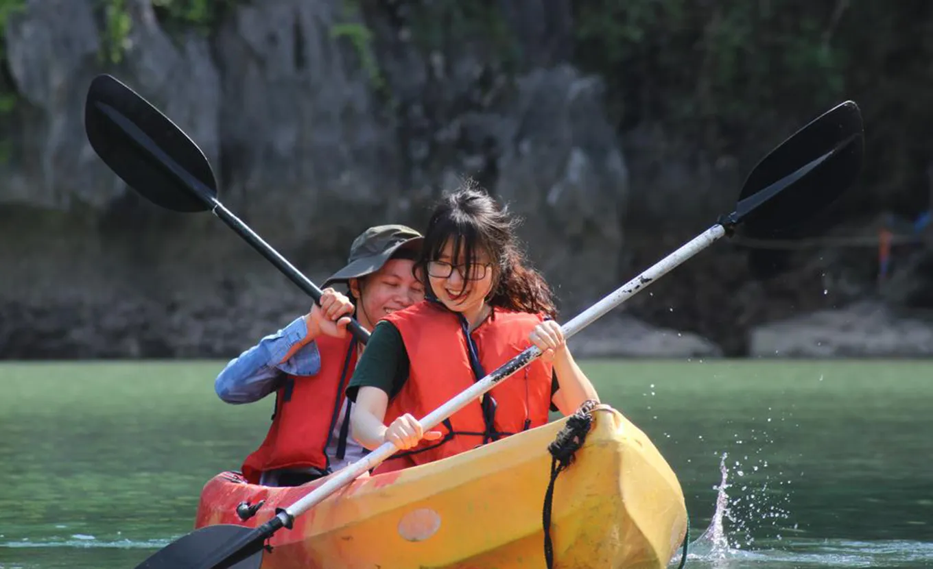 12:15: The cruise starts at the port of Ben Beo of Cat Ba Island where you embark on board. After a welcome drink, the junk crosses the floating fishingvillage and then sneaks into Lan Ha Bay.