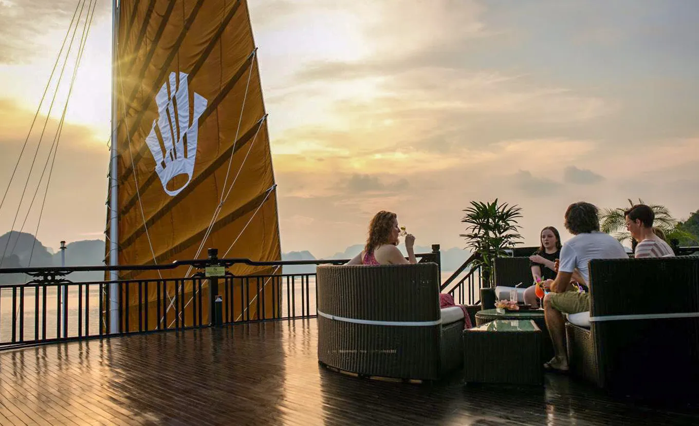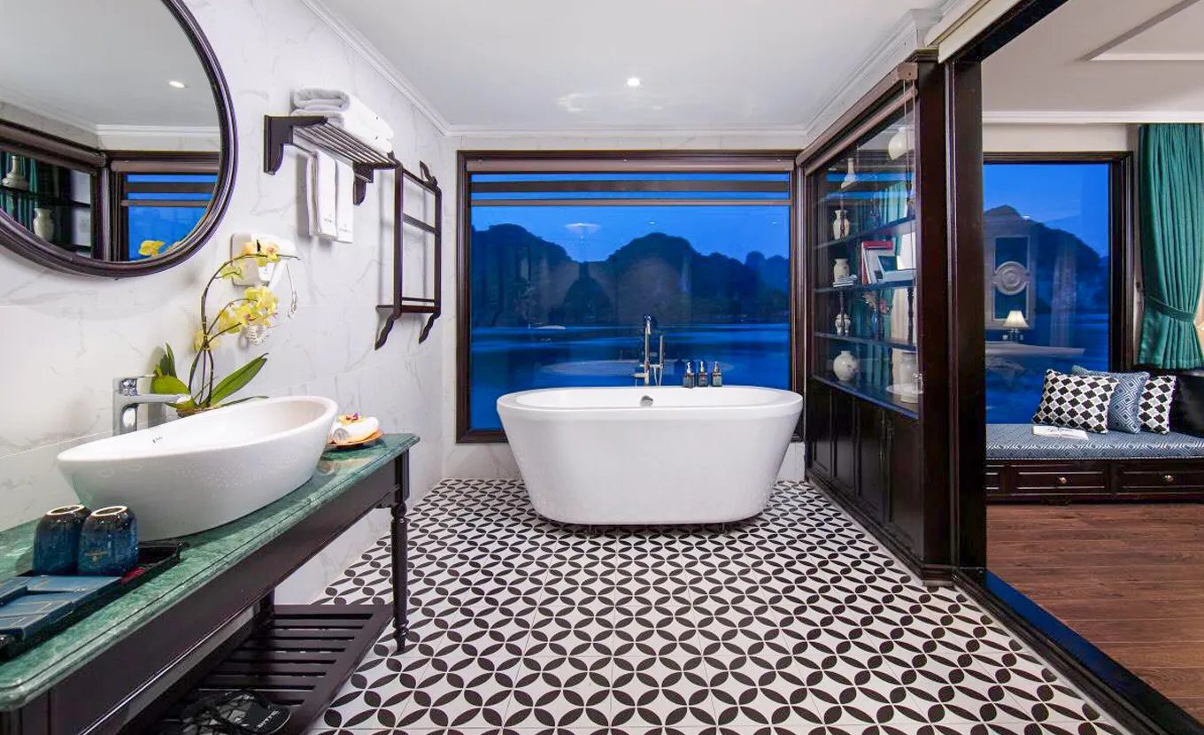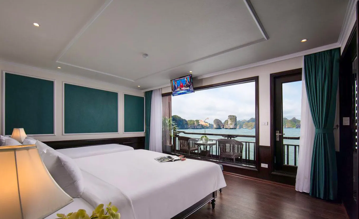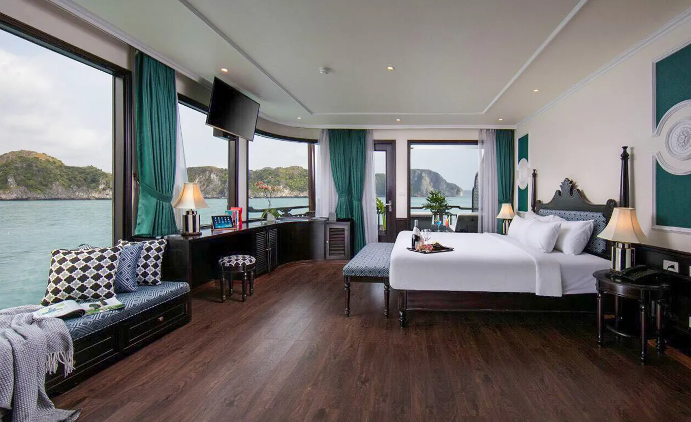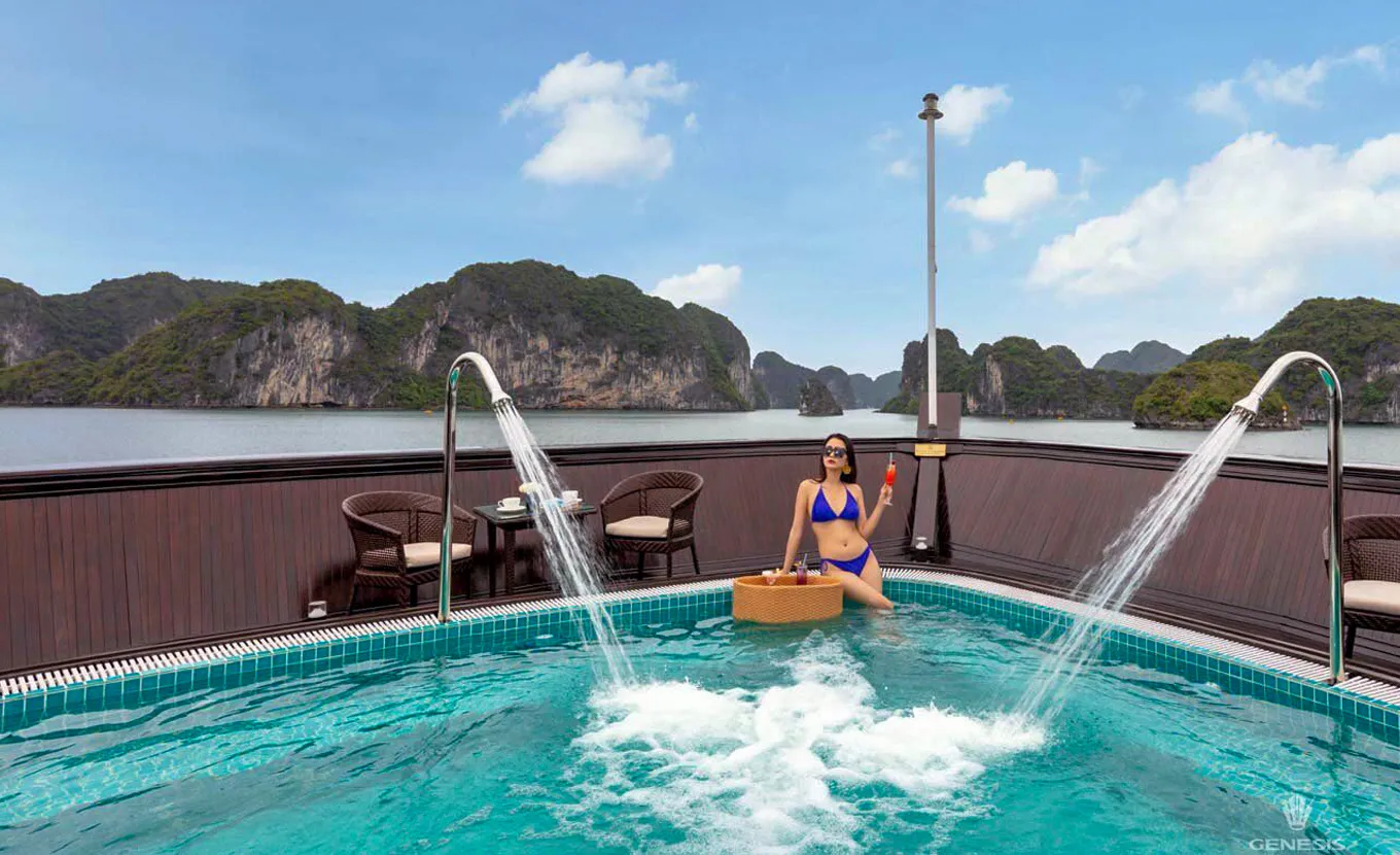 The Genesis Regal Cruise, launched in 2019, beautifully fuses Vietnamese royal tradition with French colonial style. It houses 20 spacious cabins, each with private balconies and sea-facing beds — a rarity among yachts. Offering luxurious facilities like indoor/outdoor dining, bars, a swimming pool, Jacuzzi, and an expansive 800m2 sundeck. Beyond the usual spots, Genesis Cruise provides diverse activities: from swimming at pristine beaches, Tai Chi classes, cooking sessions, fishing, and visits to local homes.
