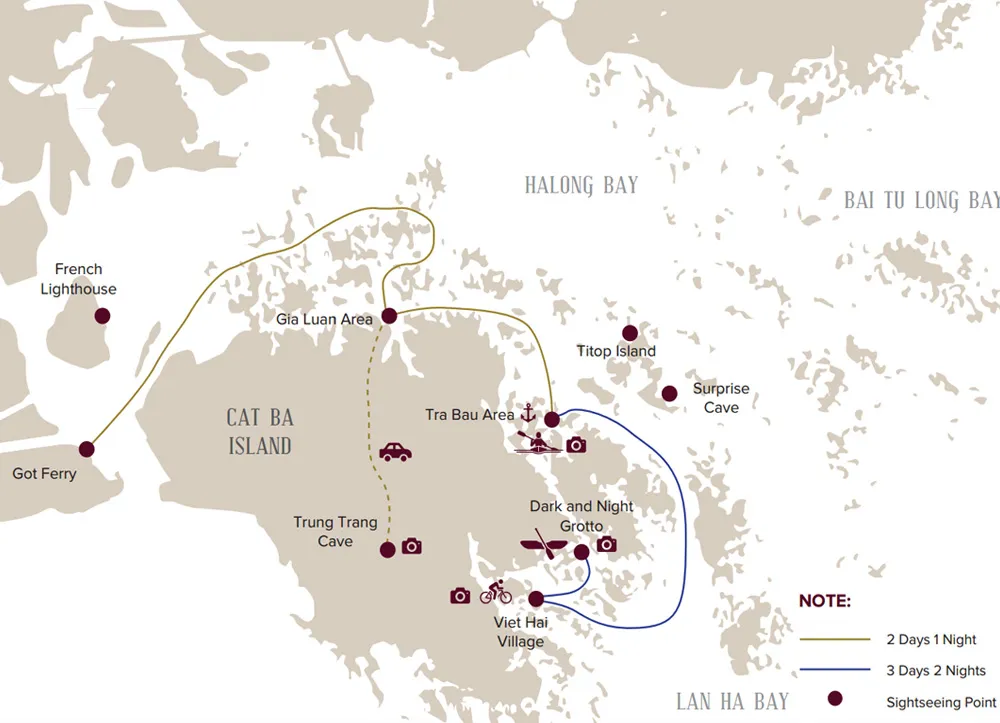 - Option 3: Boarding tender for a ride around Viet Hai fishing village that can combine with swimming at a beach nearby.