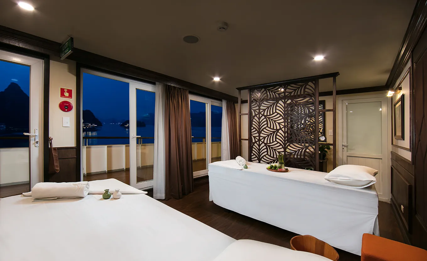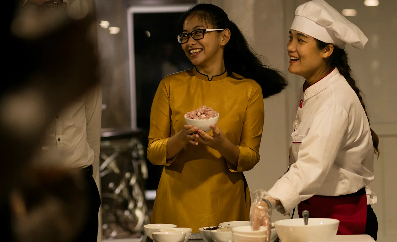 18:30: Then take part in cooking demonstration to learn about our Vietnamese cuisine. You can also enjoy the massage service which is available onboard. (Please book directly with the Cruise Manager on the boat)