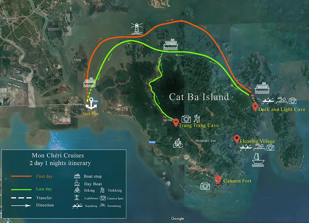 15:30: We arrive at Light and Dark Cave, where you can do kayaking or bamboo boat rowed by local people. Then return to Mon Chéri Cruises, followed by swimming near the ship.