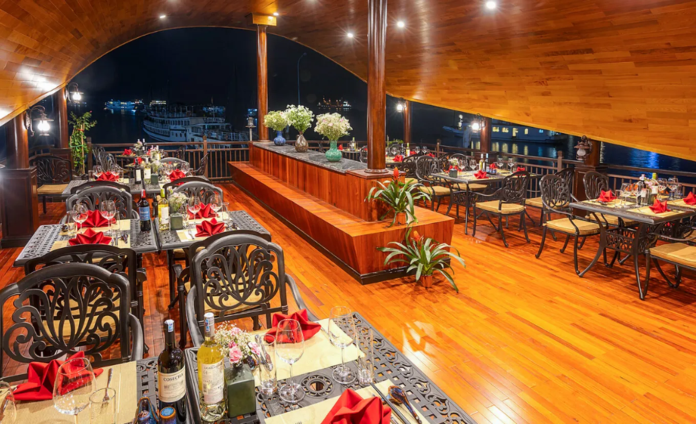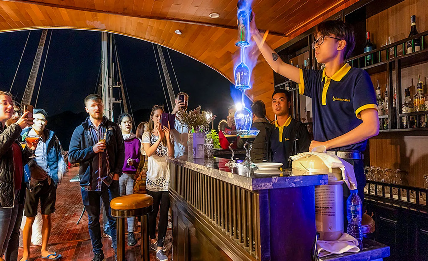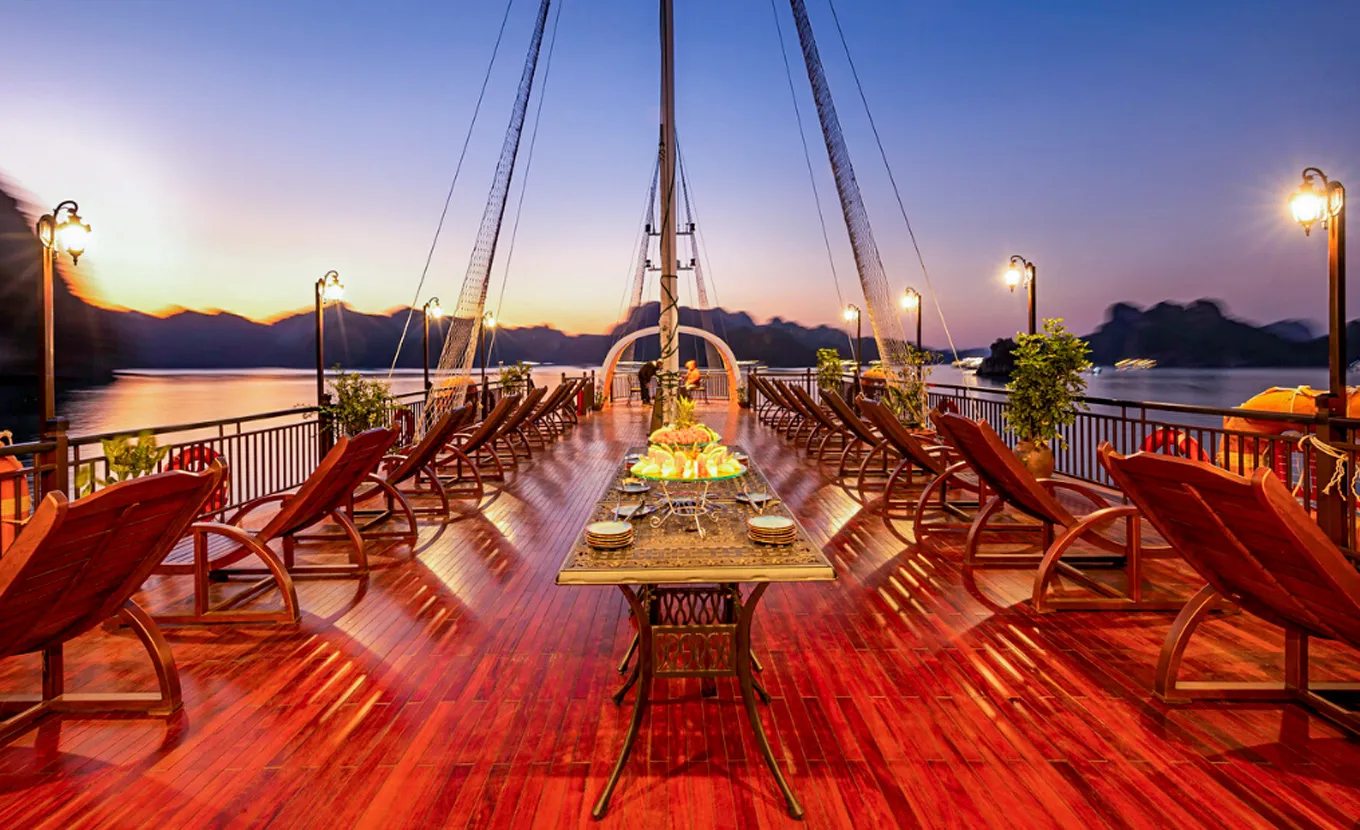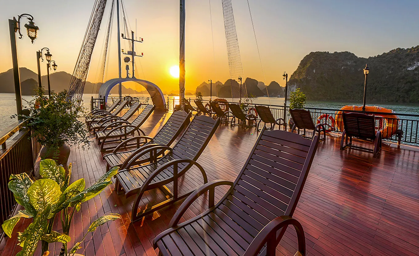 17:00: Return to Sena Cruise and relax on the cruise. Enjoy our sunset time and the “Happy Hour Deal” in all bars on the cruise. You will also have a chance to join our cooking class to challenge your skills in preparing the famous Vietnamese spring rolls. Before dinner, our experienced captain will choose the most tranquil area to anchor for overnight.