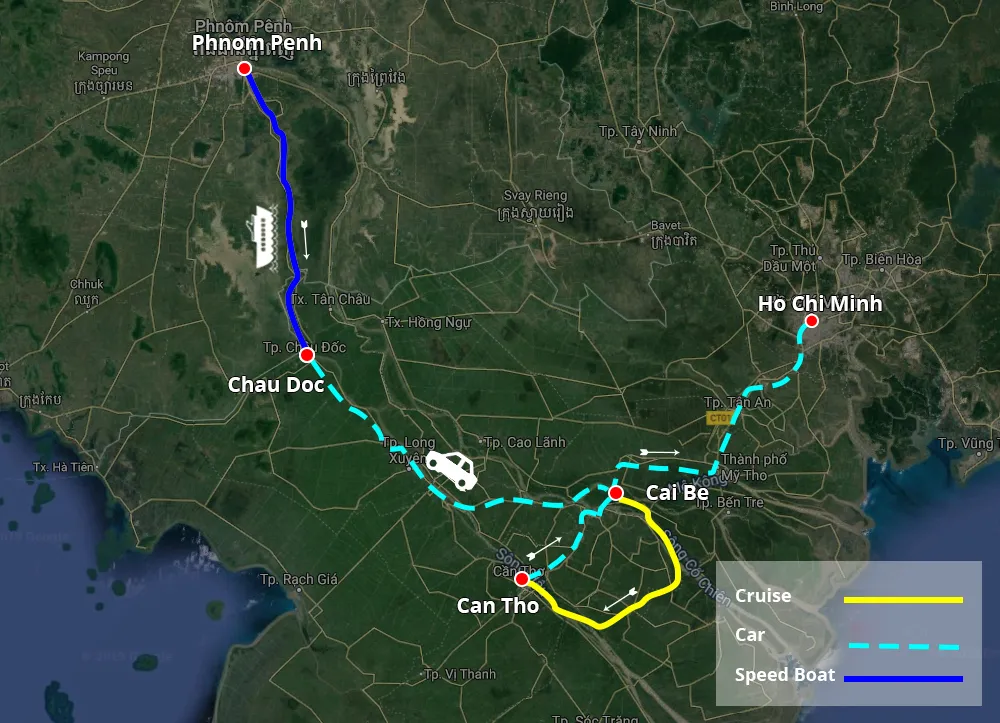 Travel from Phnom Penh (Cambodia) to Chau Doc (Vietnam) by speed boat then start your unique journey to discover the well-known Mekong Delta. Mekong Dragon Eyes boat is designed very charming and elegent follows traditional boats on Mekong River with only 02 cabins which is very comfort for couple, family or small group of friends.