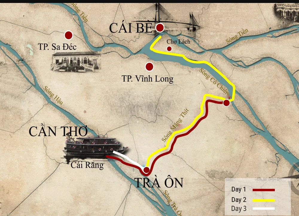 08:00: Check-out of cabin, Excursion on a long sampan to Cai Rang floating market and noodle producing family